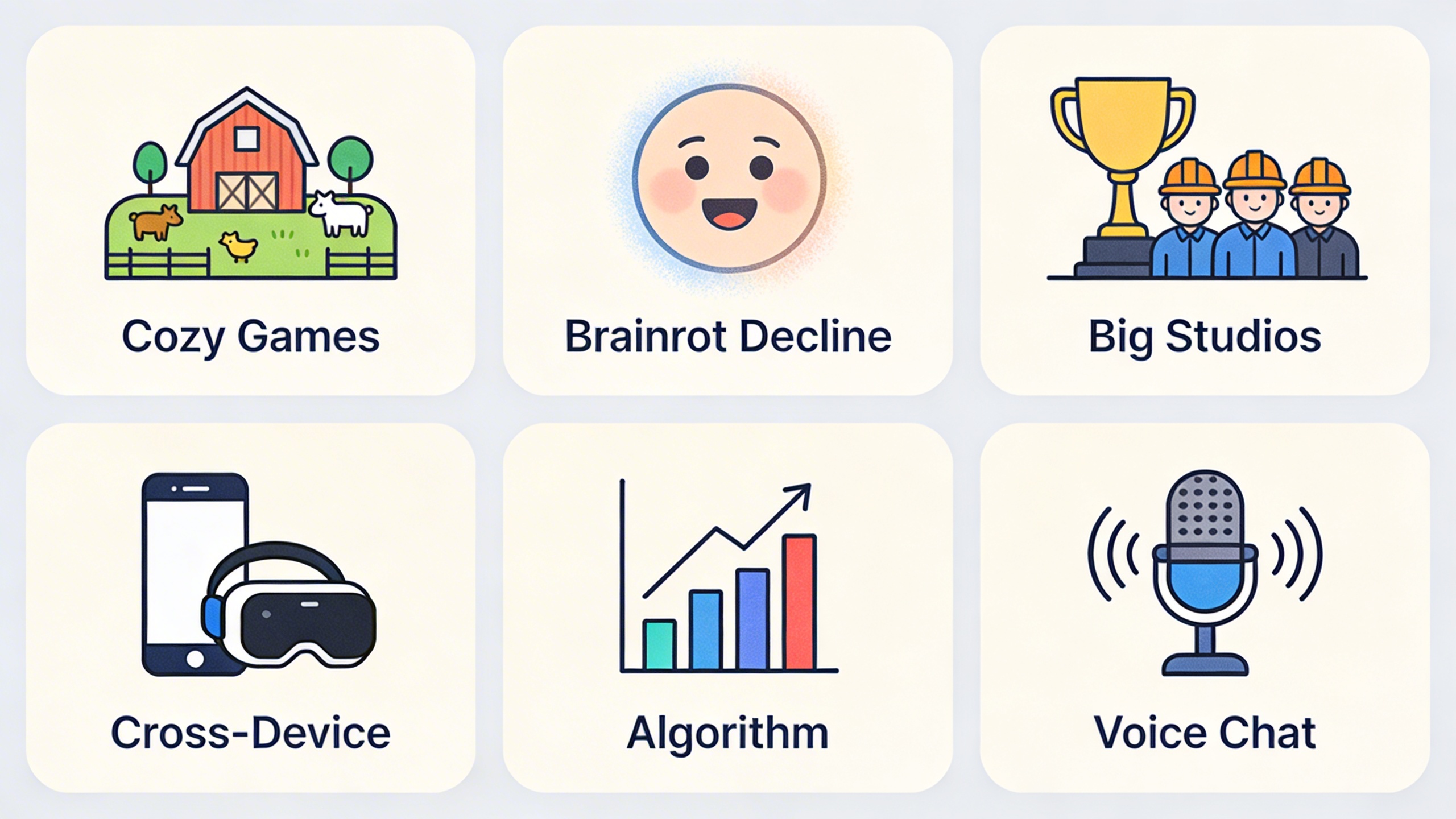 Grow a Garden showed that a simple, calm daily-loop game can beat flashy, complicated games on the charts. Expect more games in this style to launch in 2026 — farming, fishing, decorating, collecting. They are cheap to make, easy to play on phones, and the algorithm loves their session frequency. At least 3–5 new cozy games will likely crack the top 20 by September.